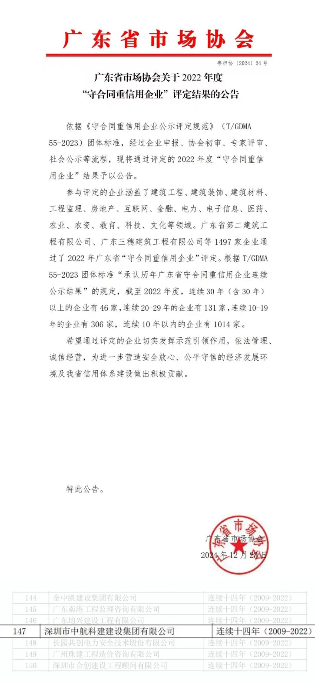 ? ? 近日,廣東省市場(chǎng)協(xié)會(huì)發(fā)布2022年度“守合同重信用企業(yè)”評(píng)選結(jié)果。中航科建集團(tuán)連續(xù)十四年榮獲廣東省“守合同重信用企業(yè)”稱(chēng)號(hào)。